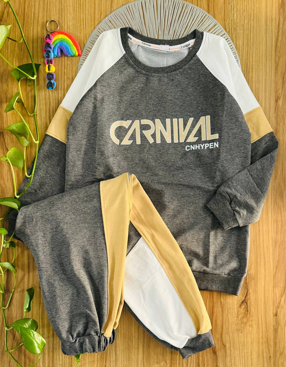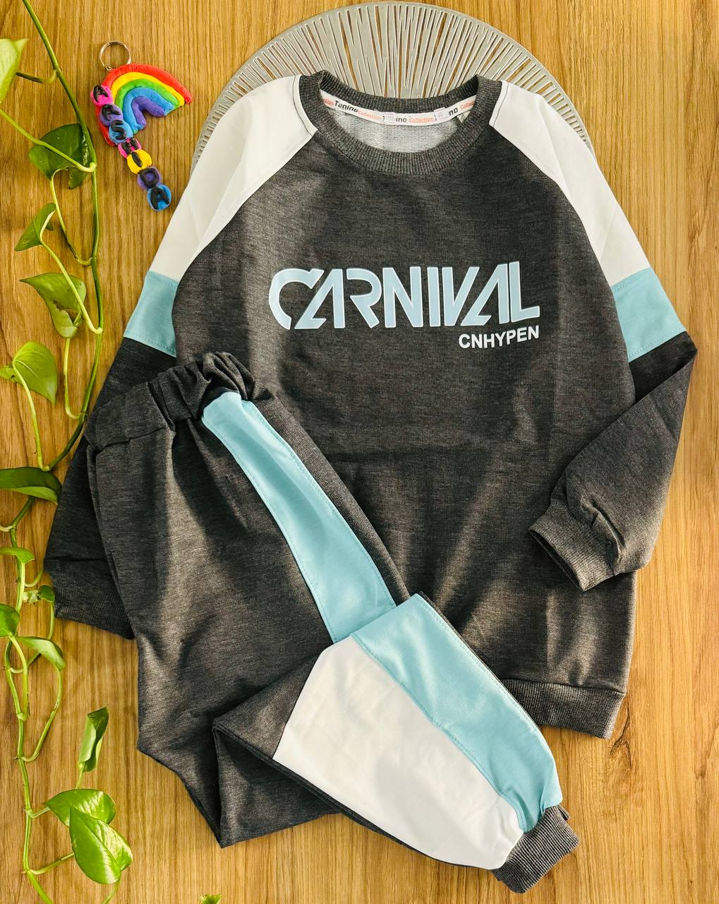 ست بلوز و شلوار بچگانه مدل Carnival با ترکیب رنگ طوسی، سبز و سفید، انتخابی ایدهآل برای استایل اسپرت کودکان. این ست از جنس نرم و لطیف تهیه شده و مناسب استفاده روزانه، و منزل است