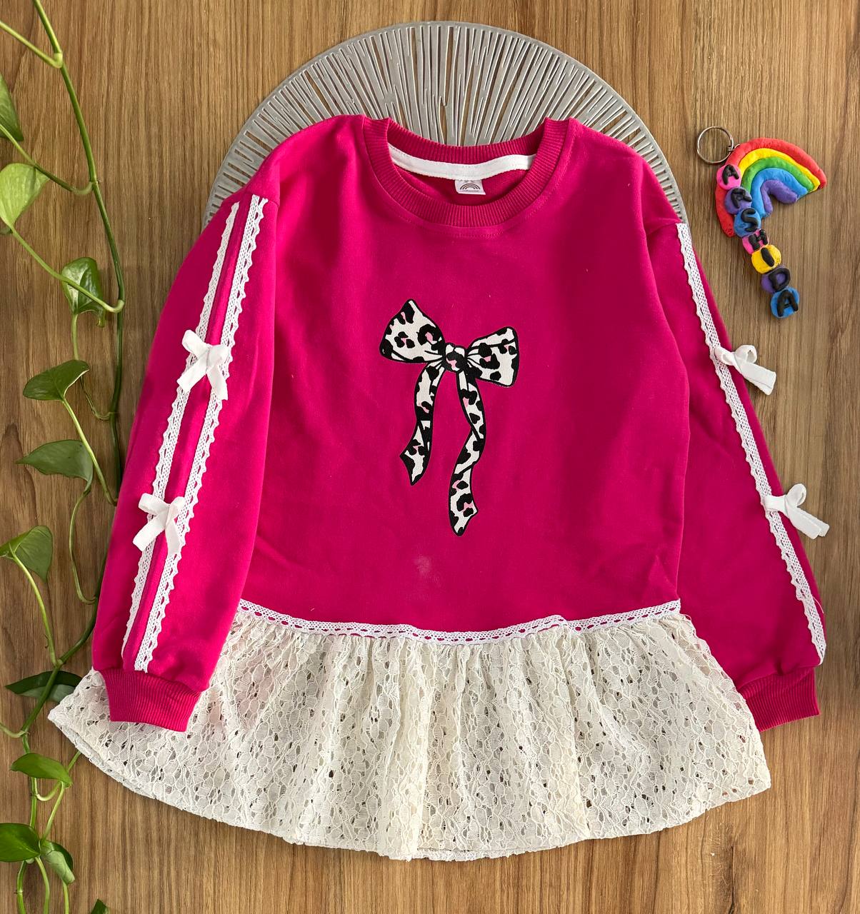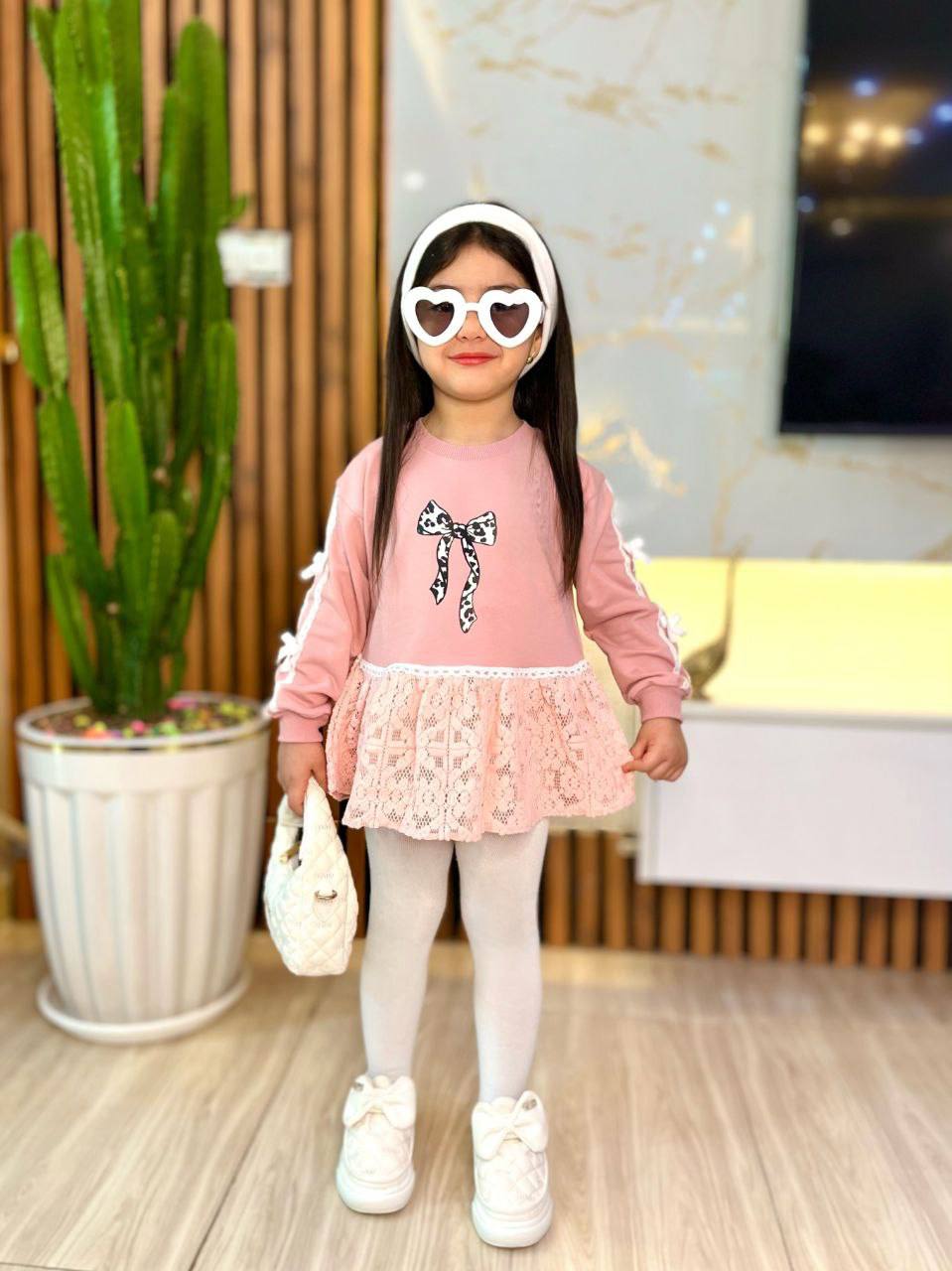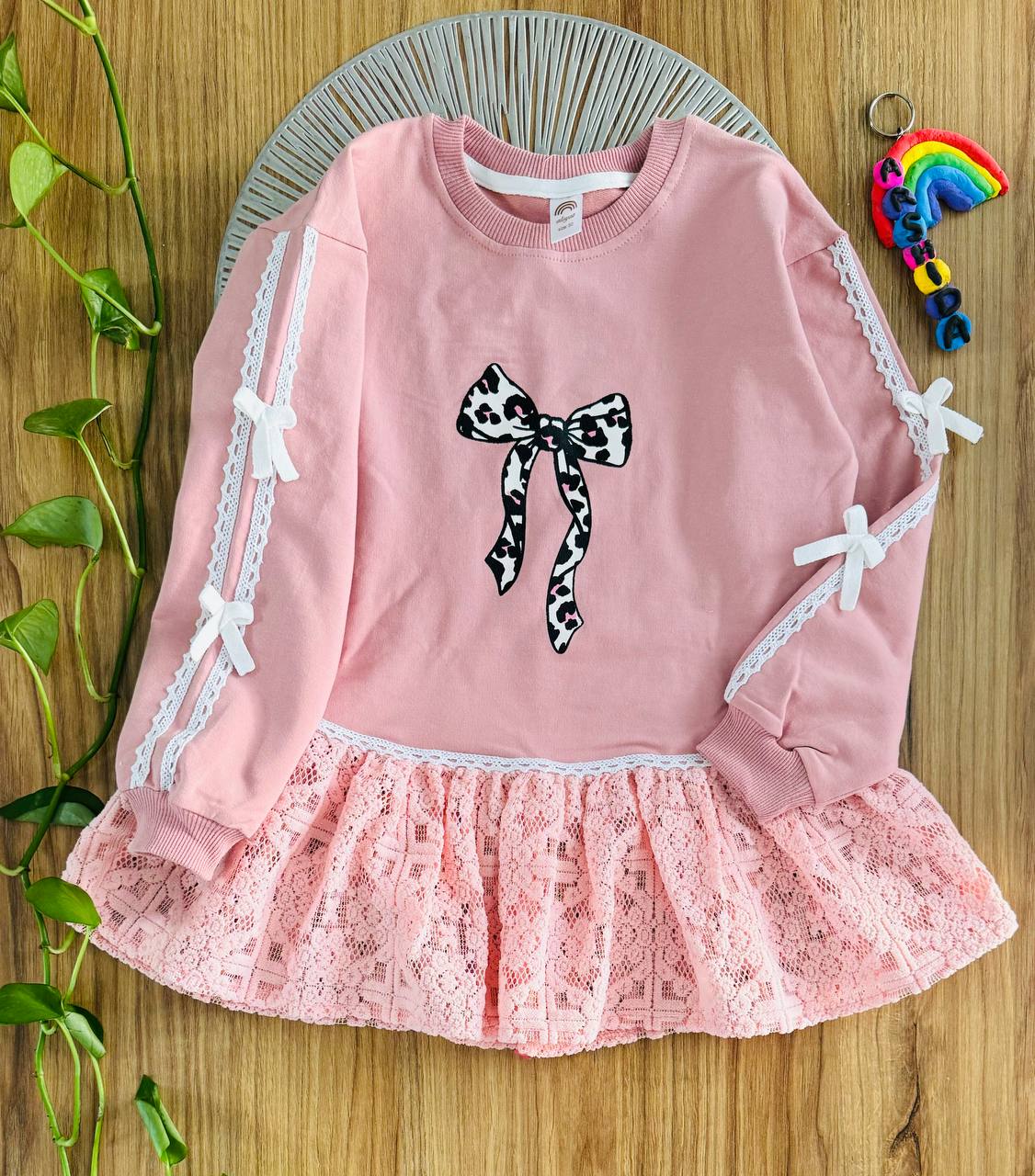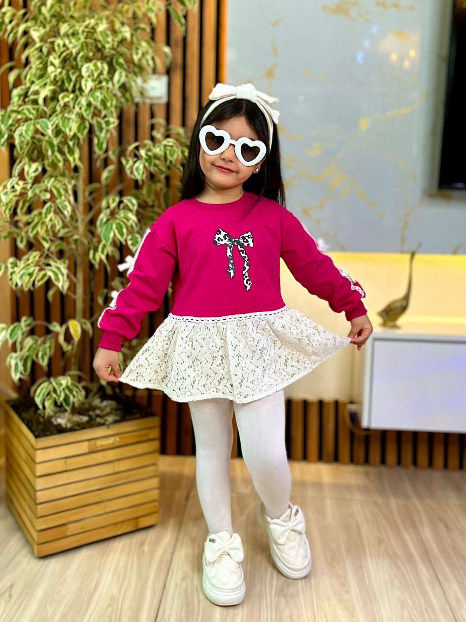 تونیک دخترانه صورتی با طراحی خاص و فانتزی، دارای دامن گیپور لطیف و پاپیون چاپی زیبا روی سینه. این تونیک آستینبلند با نوار دانتل و پاپیونهای ظریف روی آستین، انتخابی عالی برای مهمانی، تولد و استفاده روزمره کودک است. پارچه نرم و باکیفیت، مناسب پوست حساس کودکان