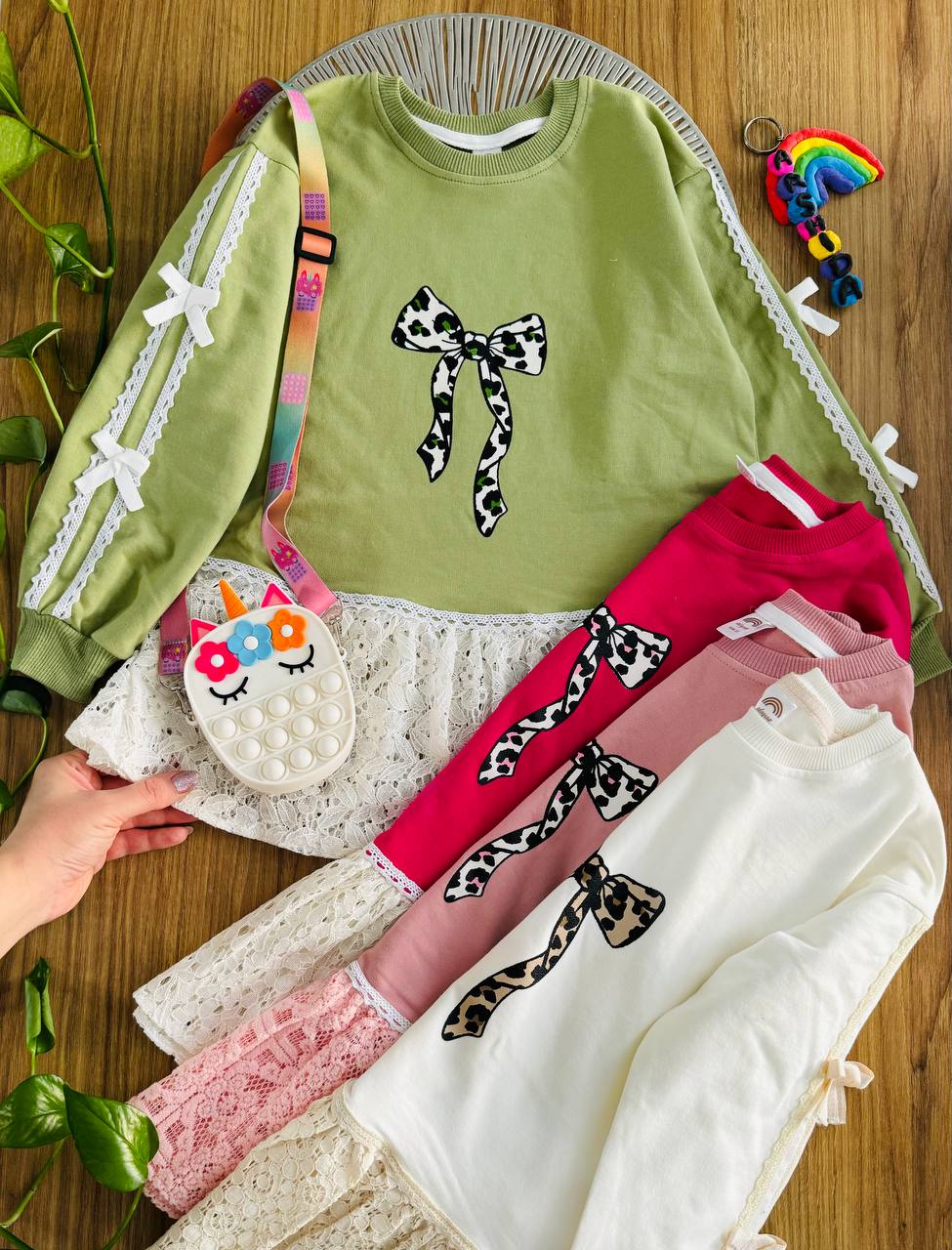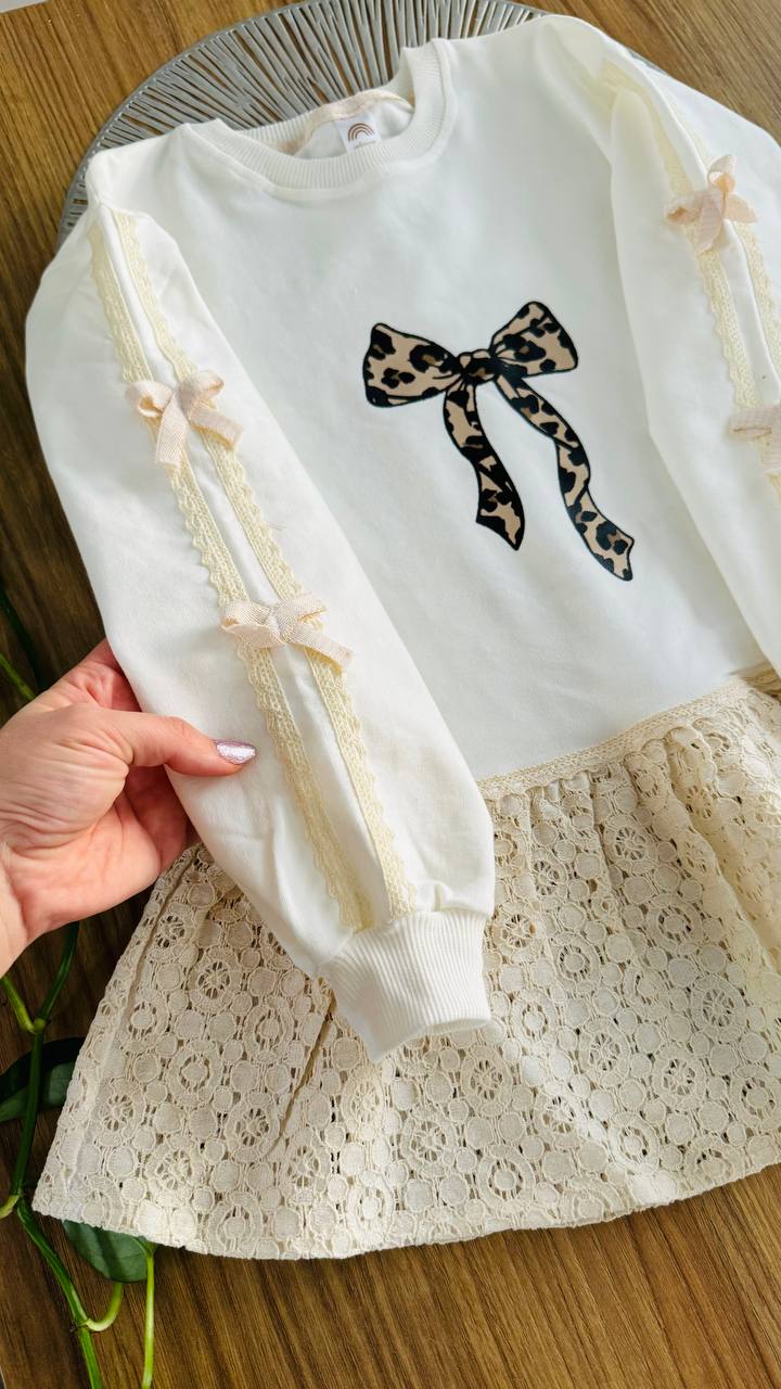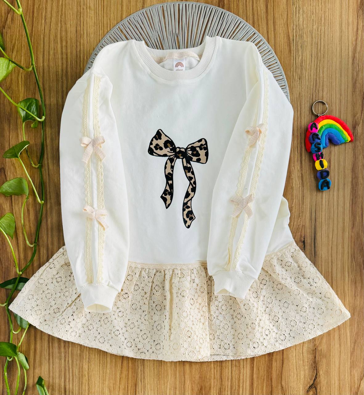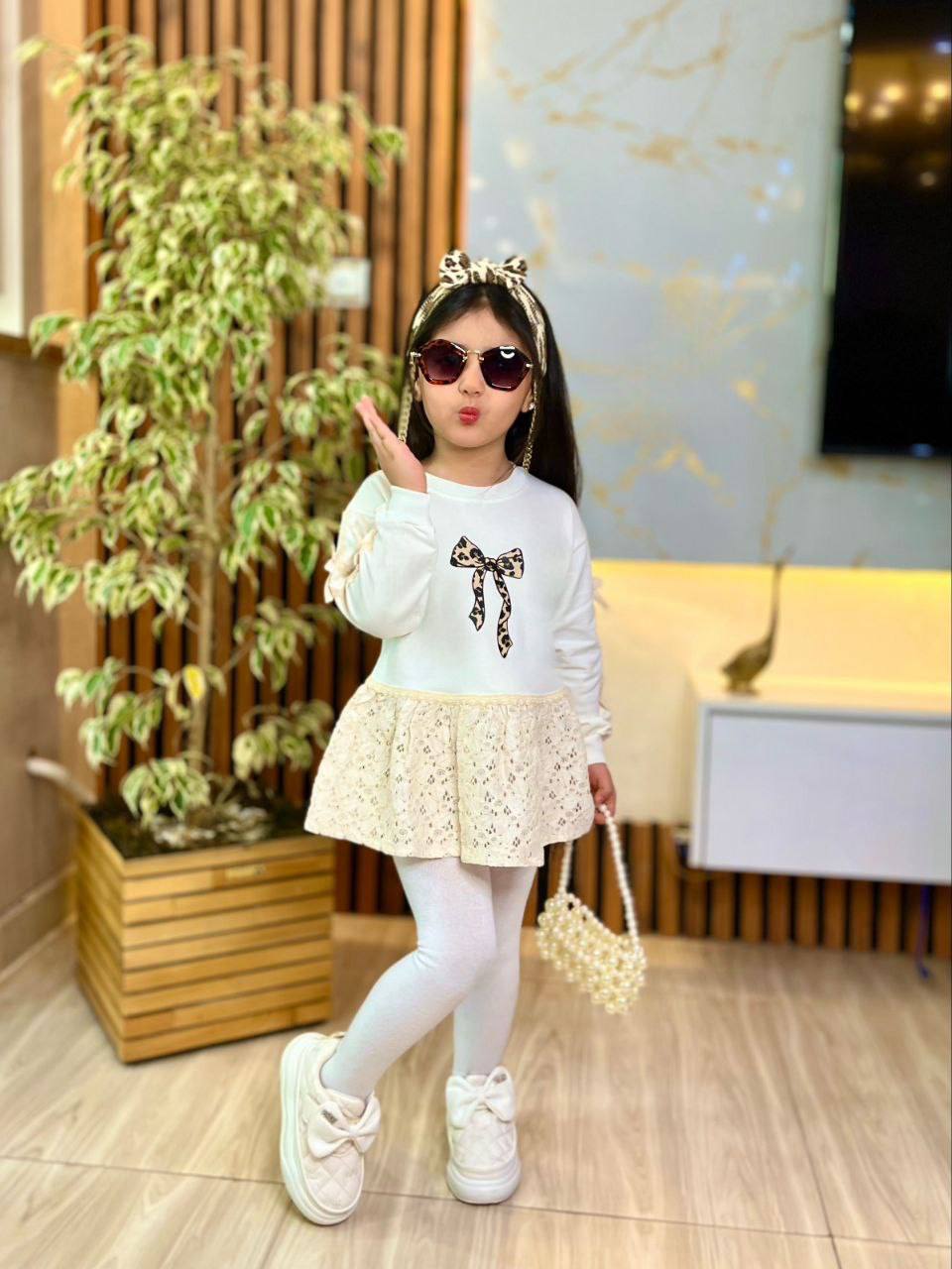 تونیک دخترانه صورتی با طراحی خاص و فانتزی، دارای دامن گیپور لطیف و پاپیون چاپی زیبا روی سینه. این تونیک آستینبلند با نوار دانتل و پاپیونهای ظریف روی آستین، انتخابی عالی برای مهمانی، تولد و استفاده روزمره کودک است. پارچه نرم و باکیفیت، مناسب پوست حساس کودکان