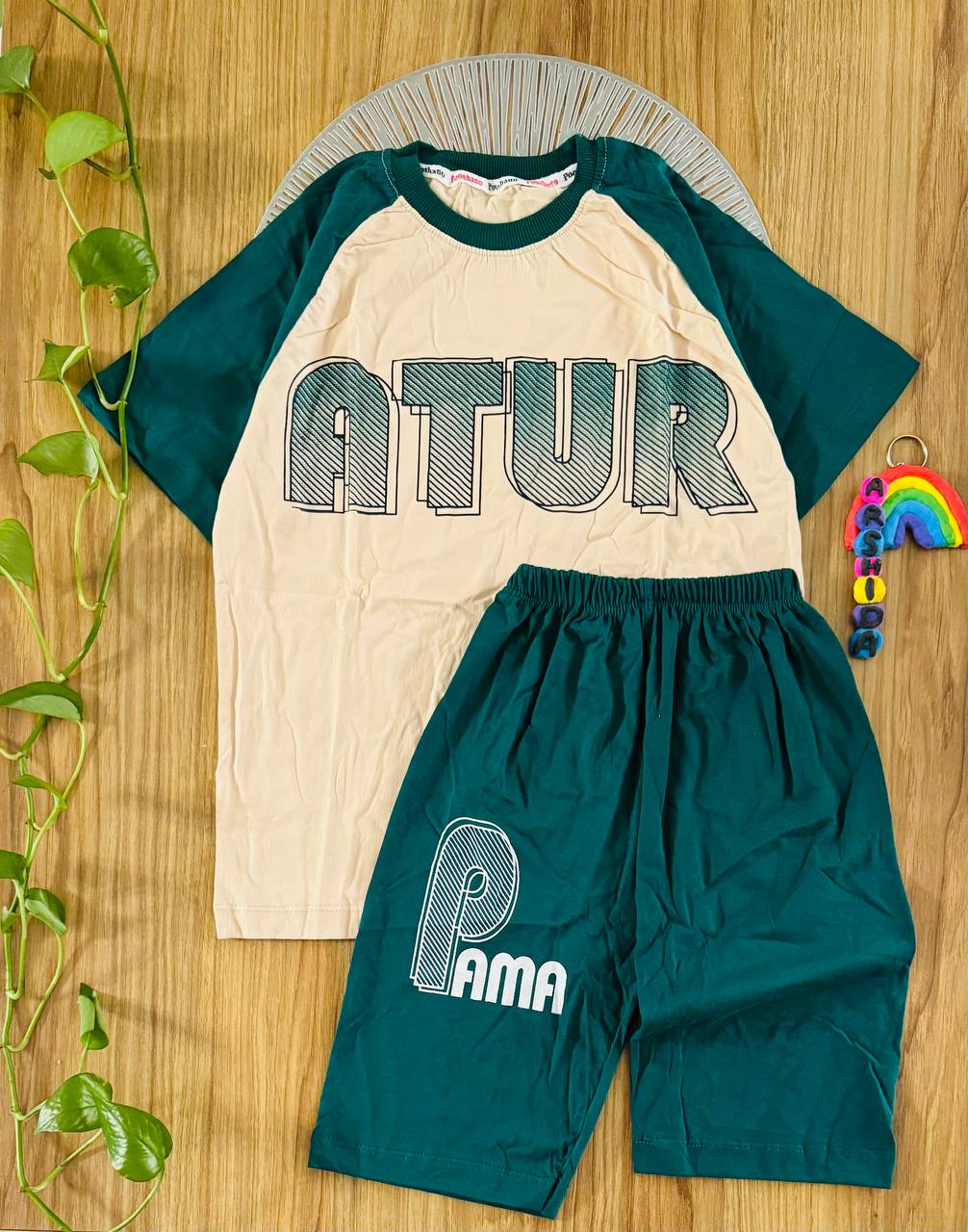 خرید ست تیشرت و شلوارک پسرانه رنگ سبز و کرم، مناسب ۸ تا ۱۲ سال. جنس نخ پنبهای، راحت و خنک، مناسب استفاده روزمره و تابستانی با تنخور عالی