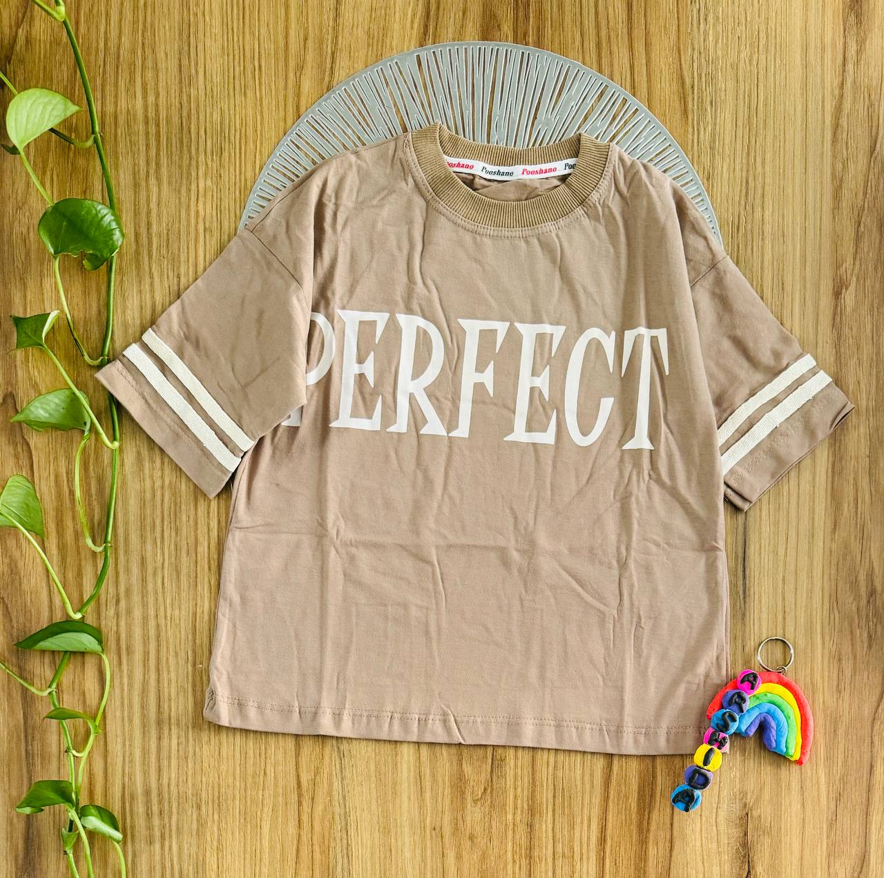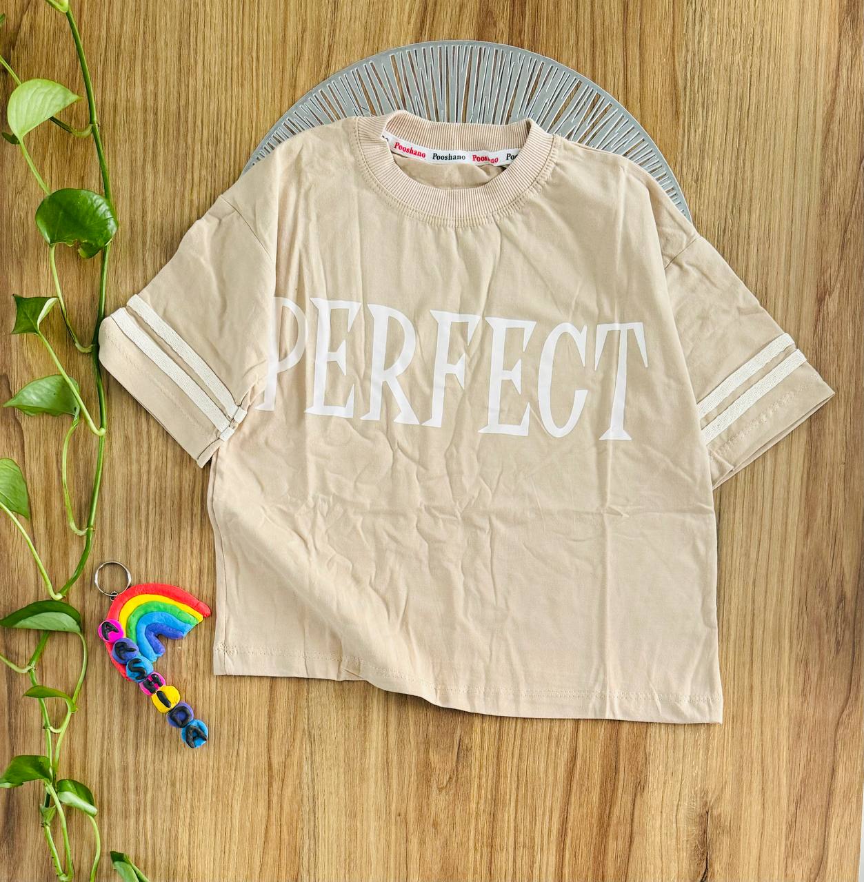 خرید تیشرت دخترانه مدل PERFECT رنگ کرم، مناسب ۸ تا ۱۲ سال. جنس نخ پنبهای، خنک و راحت با طراحی اسپرت و ترند، مناسب استفاده روزمره، پارک و مهمانیهای دوستانه