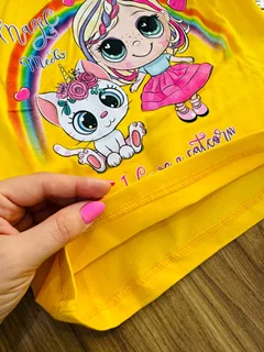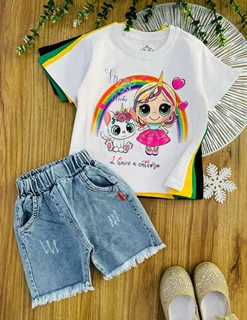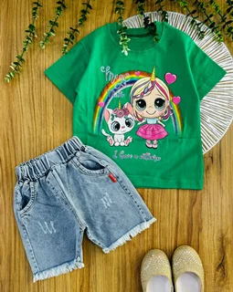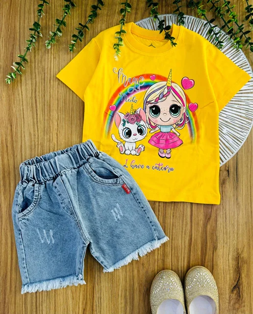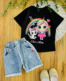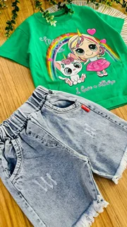 چاپ دختر و گربه.رنگبندی تیشرت عالی.شلوارک لی زاپدار
